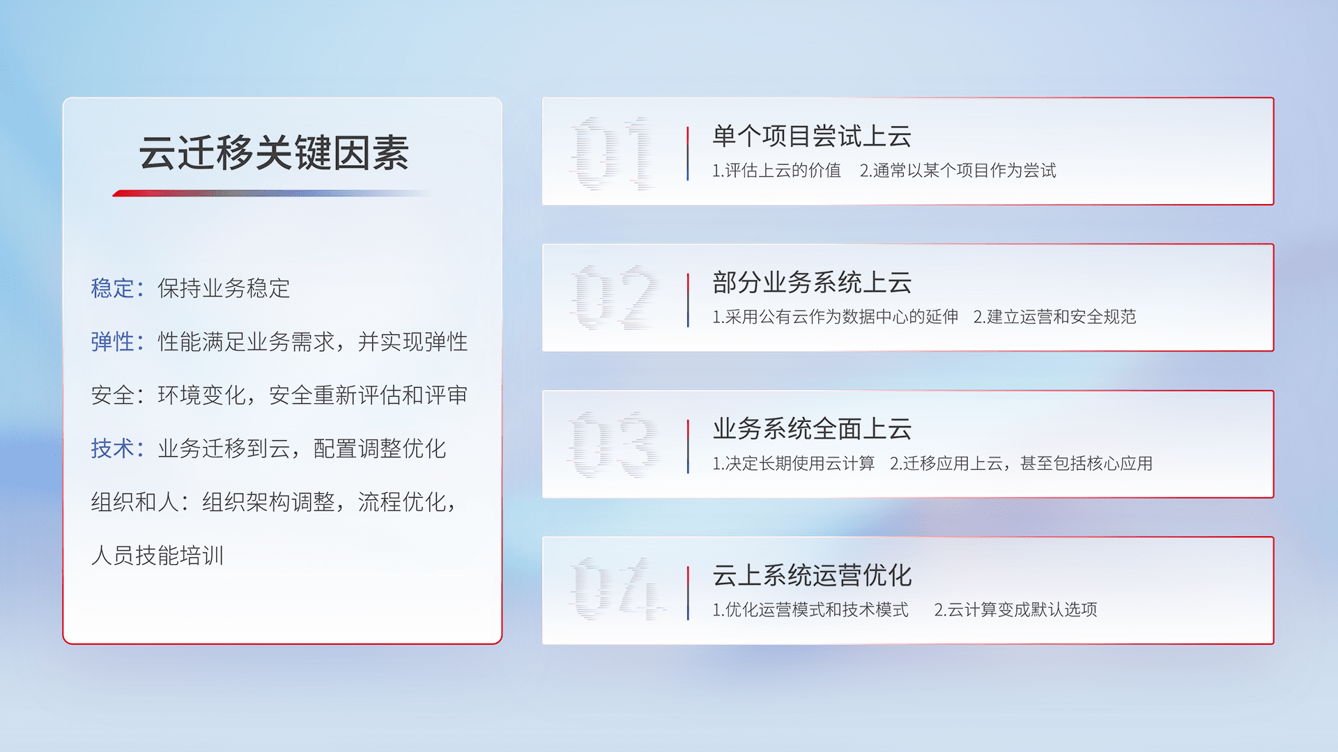 结合实际业务,,,,从规划设计、、云平台选型、、云原生改造、、、数据迁移、、集成交付,,,,迁移全过程为客户识别最佳上云路径,,做好风险识别管理,,,,设计网络架构、、、、身份权限、、安全审计合规、、、、操作审计、、日志审计、、、、监控告警策略、、、、多站点容灾设计等,,,对云上基础设施进行整体规划,,,提升IT治理水平,,,,以满足弹性、、、、高可用、、、高性能的需求。。。